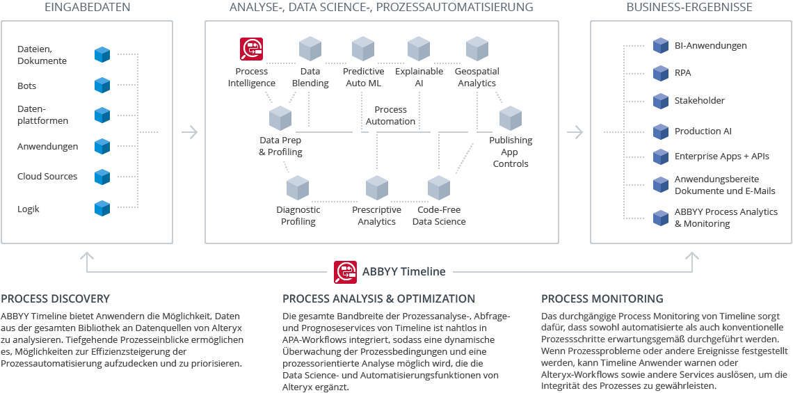 Die Kombination aus ABBYY Timeline und der Alteryx-Umgebung umfasst: