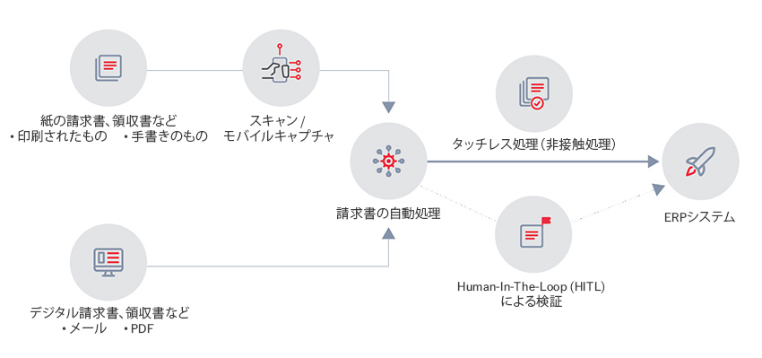 かつての請求書処理は、手作業での仕分け、確認、数値の入力に何時間もかかり、その後でさらに部門間で承認を得る必要がありました。現在においては、このような手作業はオートメーションが担うことが多くなっています。請求書のオートメーションは、主要なデータをキャプチャ、取得、検証し、その情報をビジネスシステムに直接送信することで、ストレート・スルー・プロセッシングを可能にします。